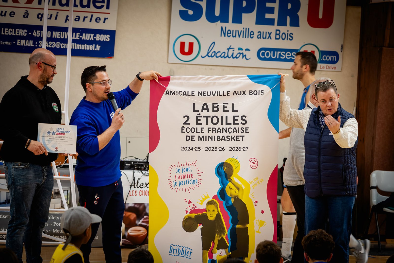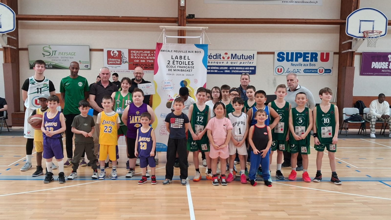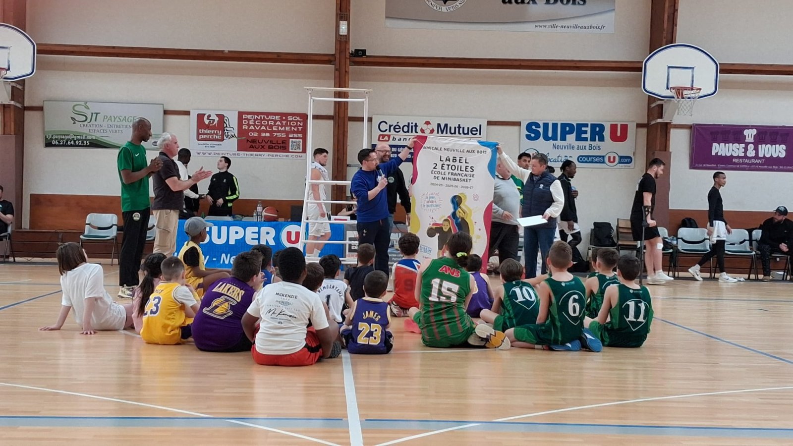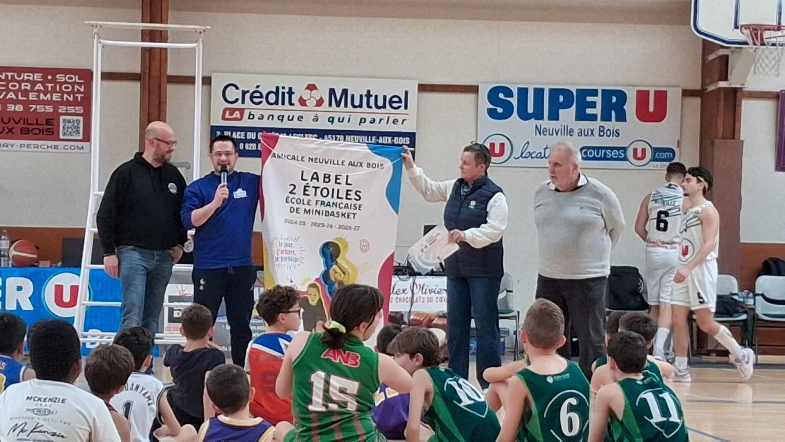 Dimanche 15 mars, notre club a reçu officiellement le Label École Française de MiniBasket 2 étoiles, une belle reconnaissance du travail réalisé avec nos jeunes. Cette distinction a été remise par Mme Valérie ALLIO, membre du bureau de la Fédération Française de BasketBall, en présence également du président de la Ligue M. Dominique TILLAY. Pour l'occasion, une journée a été dédiée spécialement au Minibasket avec au programme: