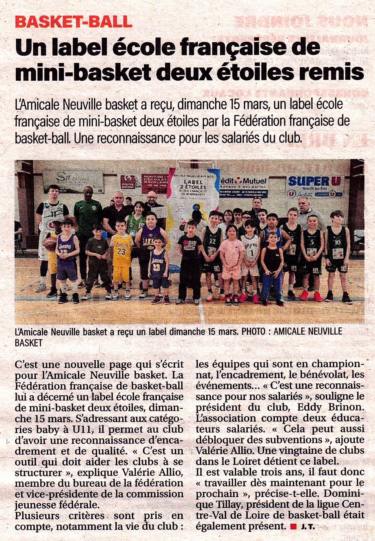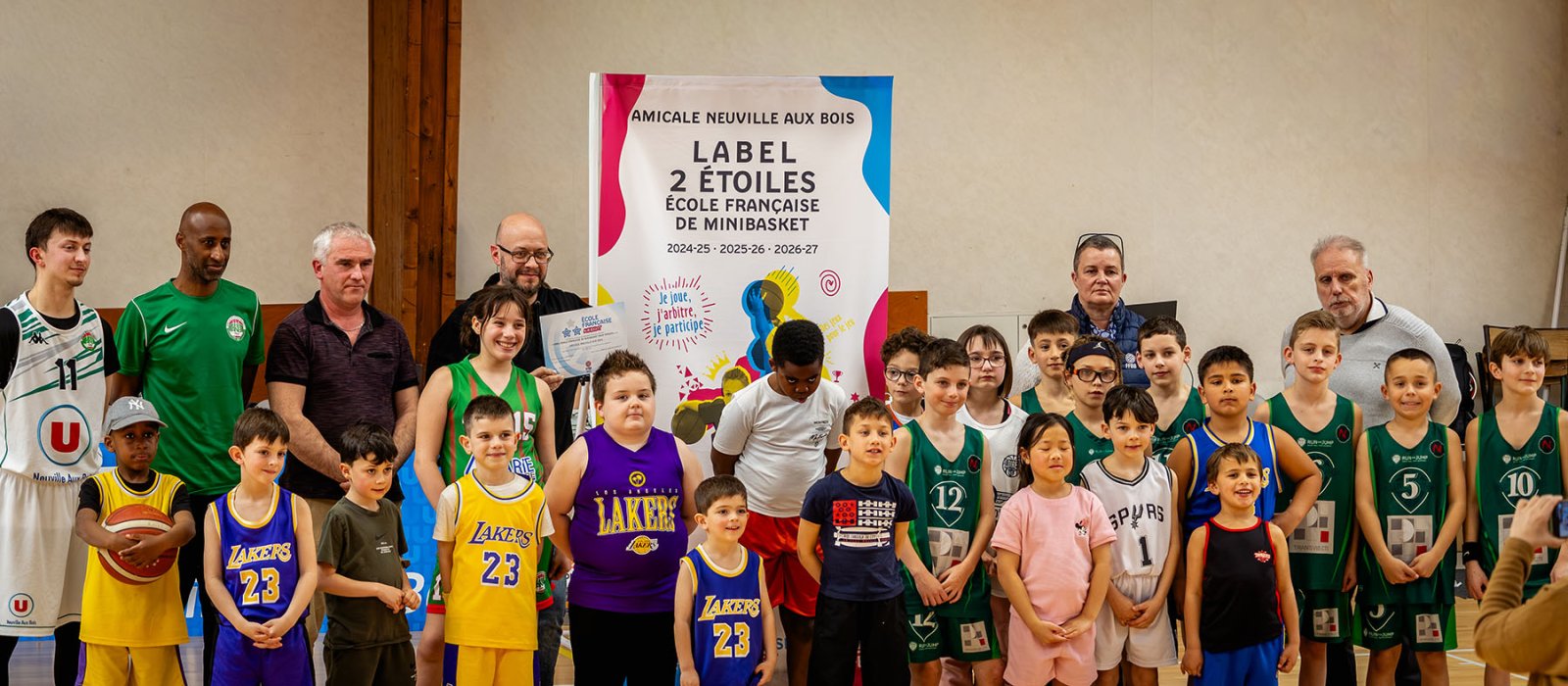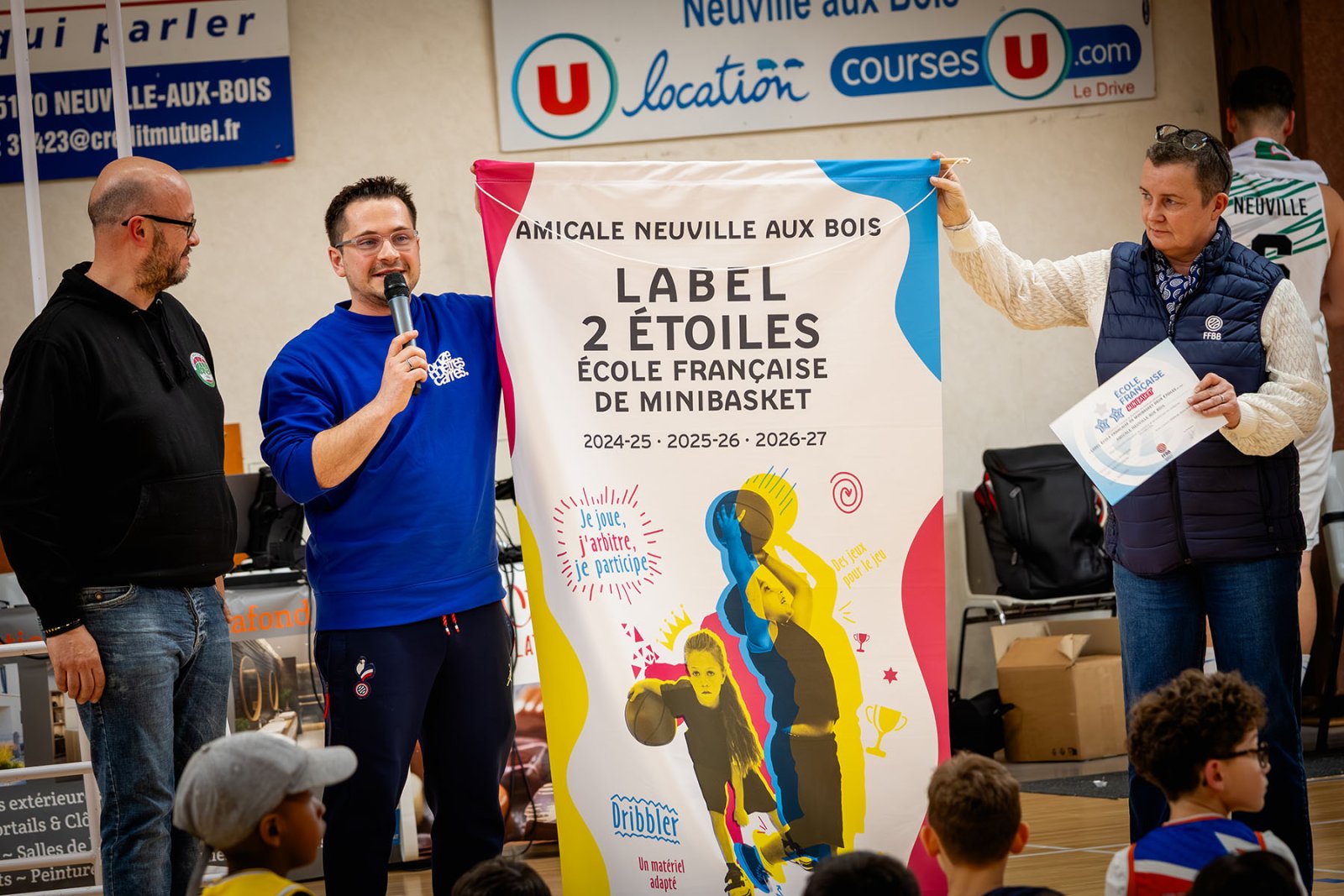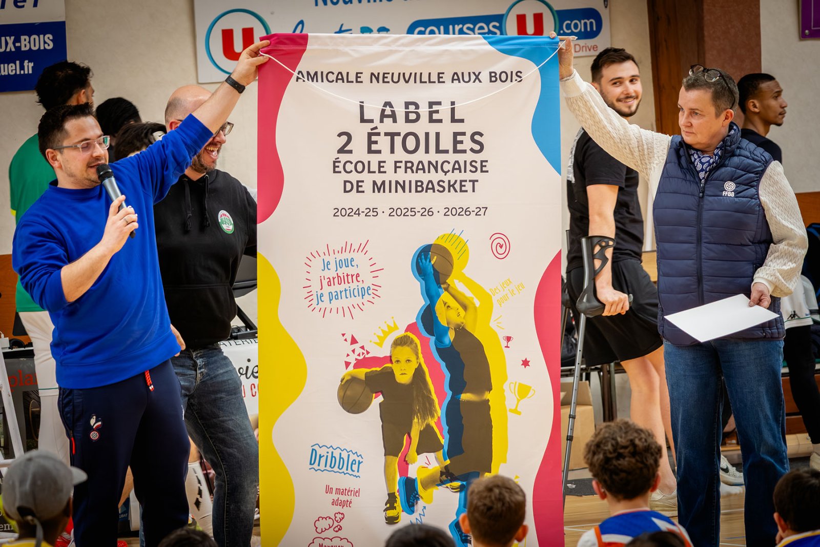 Dimanche 15 mars, notre club a reçu officiellement le Label École Française de MiniBasket 2 étoiles, une belle reconnaissance du travail réalisé avec nos jeunes. Cette distinction a été remise par Mme Valérie ALLIO, membre du bureau de la Fédération Française de BasketBall, en présence également du président de la Ligue M. Dominique TILLAY. Pour l'occasion, une journée a été dédiée spécialement au Minibasket avec au programme: